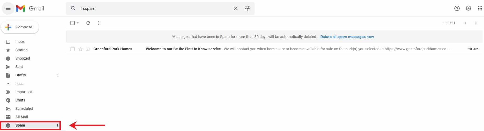 1. Using your desktop application or a browser on your desktop, access your Gmail account. Navigate to the “Spam Email” folder towards the bottom of your folder list and find the email from us.