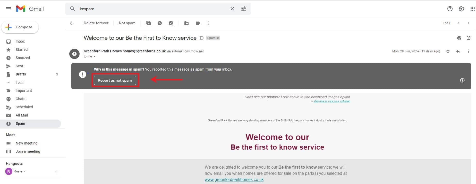 2. Click on the email to open. A pop up box will appear above the email, click on the box that says “Report as not spam”.