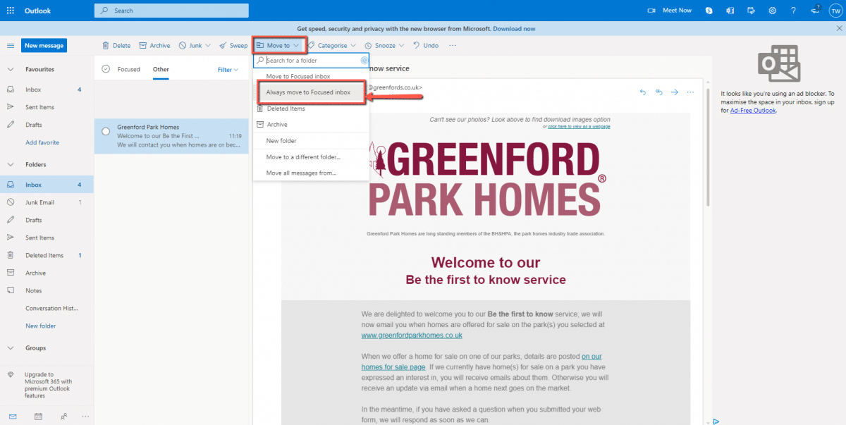 2. Go to the Move to dropdown above the message, from the drop-down menu choose “Always move to Focused inbox